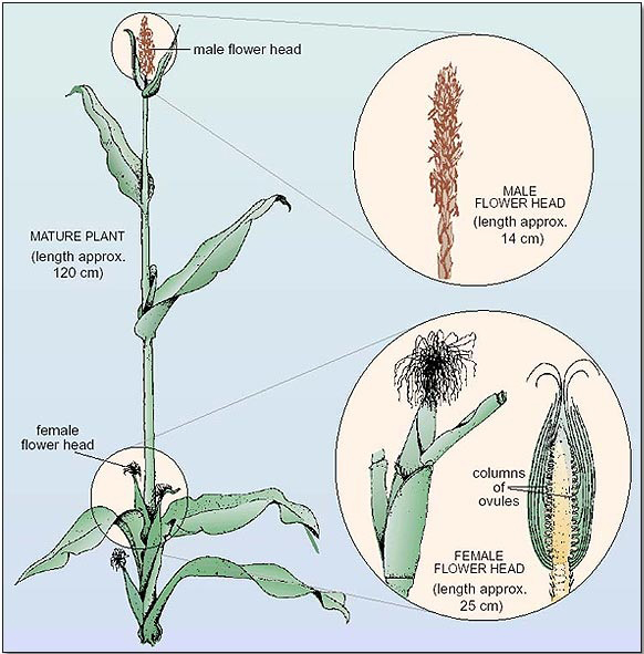 Seorang petani memulai pembiakan jagung dengan mananam bijinya. Setelah 3 sampai 4 hari, tanaman baru akan muncul di atas permukaan tanah. Tanaman jagung itu akan terus tumbuh menjadi besar. Pada usia tiga setengah bulan, tanaman jagung dapat dipanen oleh petani. Buah jagung berbentuk seperti tongkol pada muannya berupa sekuntum bunga.