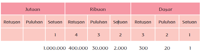 Angka bilangan diatas dibaca satu juta empat ratus tiga puluh dua ribu tiga ratus dua puluh satu