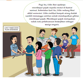 Ayah Udin membayar pajak tepat waktu. Membayar pajak merupakan kewajiban warga negara. Adapun tanggung jawab warga negara adalah membayar pajak tepat waktu.